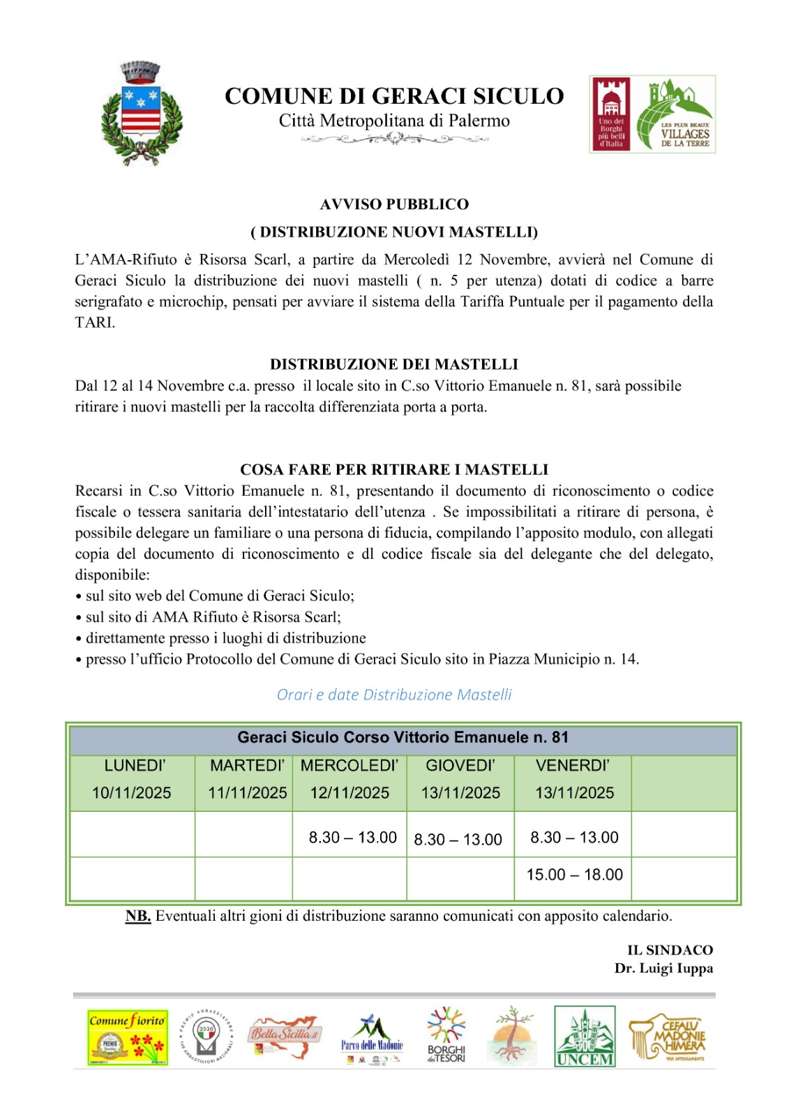 Dal 12 al 14 Novembre c.a. come da calendari distribuzione mastelli allegato, presso locale sito in C.so Vittorio Emanuele n. 81, sarà possibile ritirare i nuovi mastelli per la raccolta differenziata porta a porta.